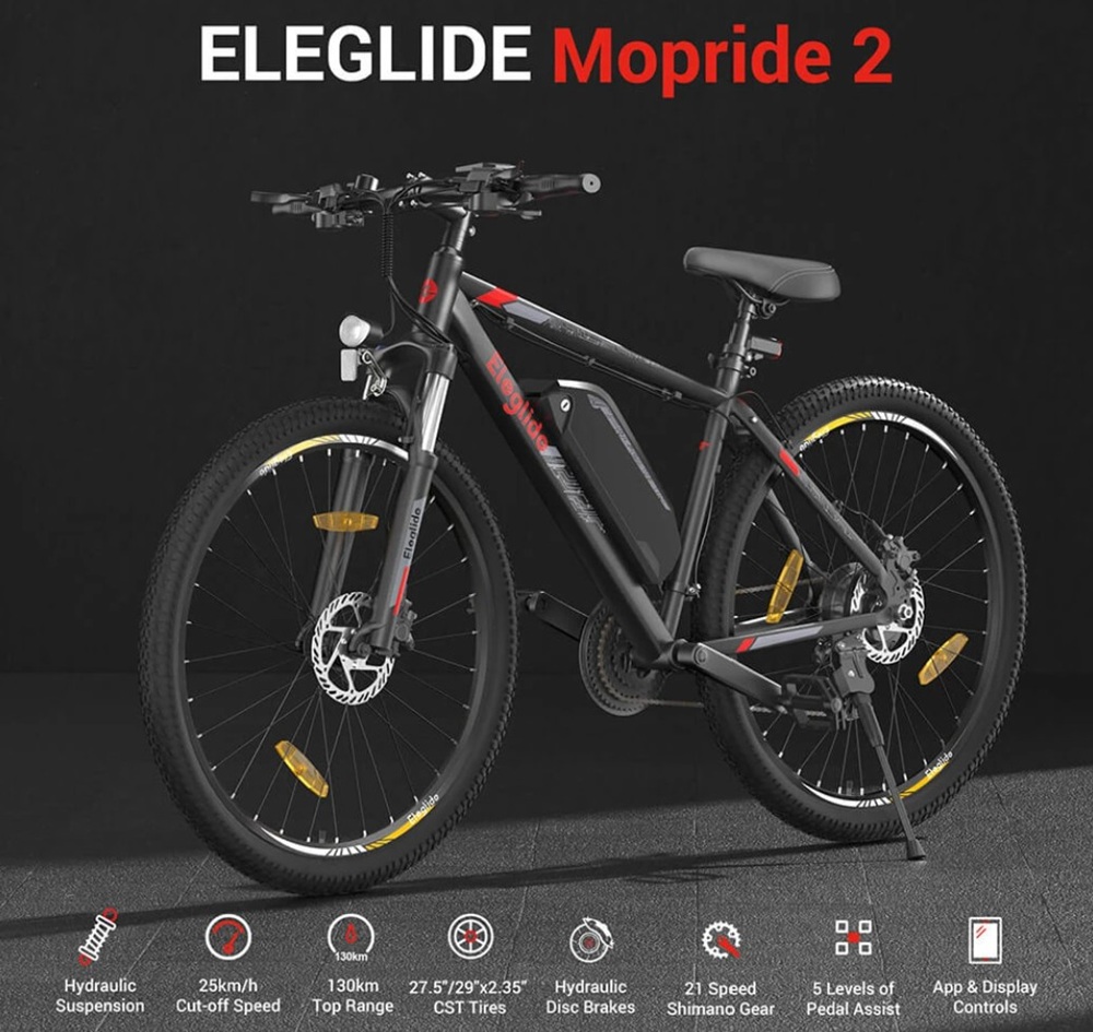 Az Eleglide M2 (más néven Mopride 2) egy erős és nagy hatótávolságú elektromos moped kerékpár, amely 250 W-os motorral (55 Nm nyomatékkal) és lenyűgöző, 130 km maximális hatótávot biztosító 36 V 15,6 Ah-s akkumulátorral büszkélkedhet. A 100 mm-es rugóúttal rendelkező hidraulikus felfüggesztése és a 29 hüvelykes CST gumijai sima és kényelmes utazást garantálnak különböző terepeken. Shimano 3×7 sebességes váltójával és hidraulikus tárcsafékeivel az M2 pontos irányítást és kiváló fékerőt kínál, így kiváló választás hosszabb kalandokhoz.