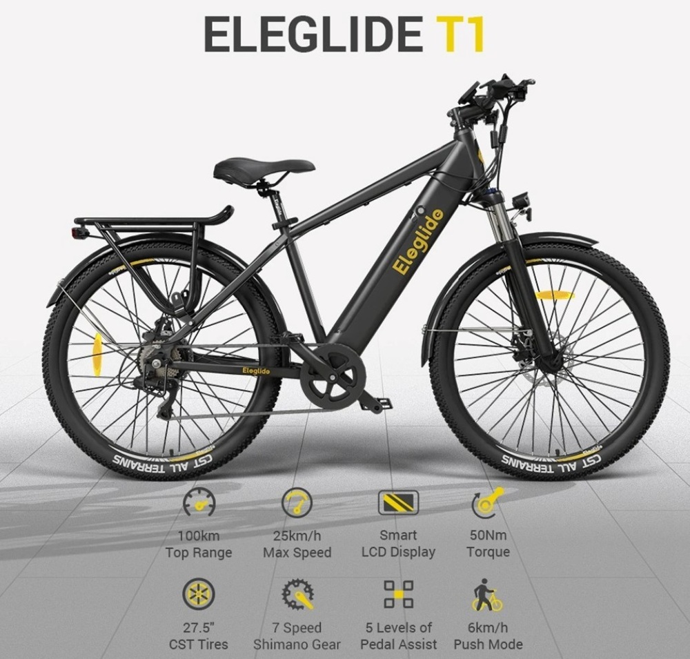 Az Eleglide T1 egy robusztus trekking e-kerékpár, amelyet sokoldalúságra terveztek. 250 W-os motorral és 36 V 13 Ah-s akkumulátorral rendelkezik, amely stabil 100 km hatótávot biztosít. Mechanikus felfüggesztésével és 7 sebességes Shimano váltórendszerével kényelmes utazást garantál, míg az első és hátsó tárcsafékek megbízható fékerőt nyújtanak. 27,5 hüvelykes CST gumikkal és 3,5″-os LCD kijelzővel a T1 jól felszerelt mind a napi ingázáshoz, mind a kalandos kirándulásokhoz, kiegyensúlyozott és élvezetes vezetési élményt kínálva.