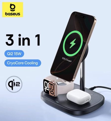 Baseus EnerFill FS41 több funkciós mágneses vezeték nélküli töltőállvány, 15W-os, hűtéssel most csak 58.99$ a BGba43b7 kuponnal (~20000 Ft). Apple Magsafe és Qi2 mágneses töltés támogatás.