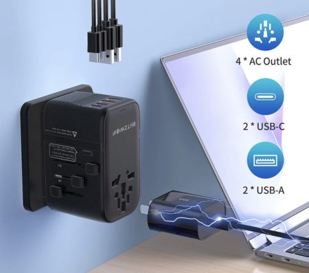 BlitzWolf BW TA3 univerzális utazó töltő és adapter most csak 21.99$ a BG29edee kuponnal (~7900 Ft). Különböző AC konnektor csatlakozók, 2 db USB-A töltőport, 2 db USB-C töltőport.