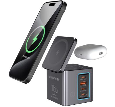 Blitzwolf BW i113 105W-os GaN gyorstöltő 6 porttal, vezeték nélküli töltéssel most csak 27.99$ a BGIEWFDF kuponnal (~9300 Ft). Mindenféle készüléket tud tölteni (Samsung, Xiaomi, Huawei, OnePlus) + szinte minden Apple cuccot, iPhone-okat, Macbookokat, AirPods füleseket, Apple Watch órákat, stb.