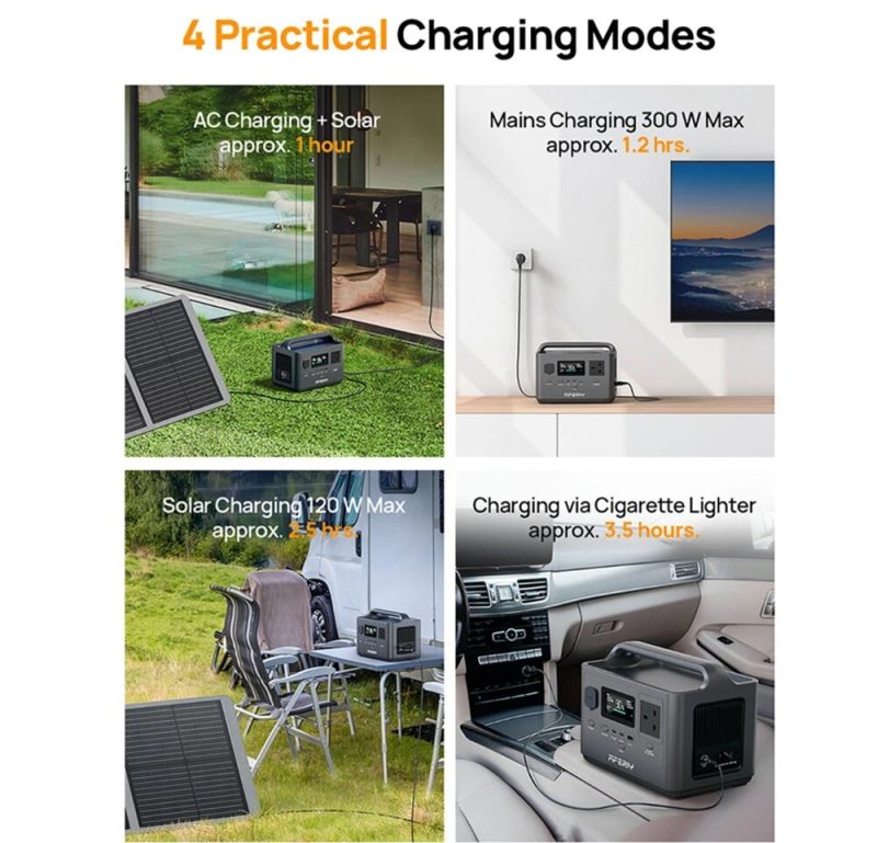 Hálózati csatlakozásról (AC) a készülék körülbelül 1,2 óra alatt teljesen feltölthető. Napelemes használat esetén – legfeljebb 120 W teljesítményű panellel – ideális körülmények között mintegy 2,5 óra alatt ismét üzemkész állapotba hozható. Emellett autós szivargyújtóról is tölthető, így utazás közben is biztosítható az energia-utánpótlás.