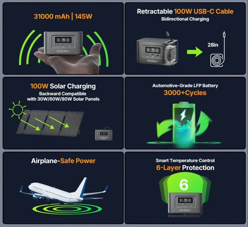 Az AFERIY Nano100 egy hiánypótló termék a piacon. Tökéletes választás mindazoknak, akik egy megbízható, biztonságos és villámgyorsan feltölthető hordozható energiaforrást keresnek utazáshoz, kempingezéshez vagy akár a mindennapokra. A LiFePO4 akkumulátor, a 100W-os teljesítmény, a repülőre vihető méret és az átgondolt funkciók (mint a beépített kábel) egy kiváló ár-érték arányú csomagot alkotnak.