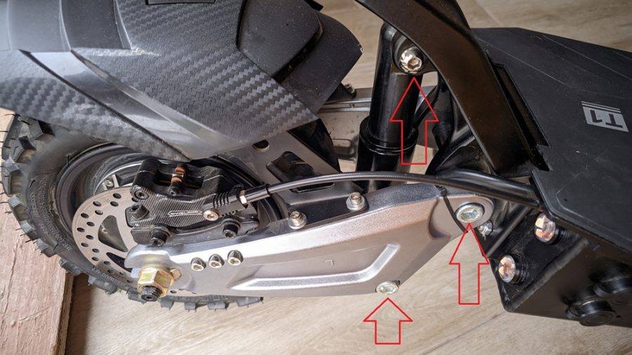 - Hátsó lengőkar és rugóstag csavarok: Az egyik legkritikusabb probléma a hátsó lengőkar, illetve a rugóstag bekötésénél lévő három csavar túlhúzottsága. Ezeket a csavarokat el kell távolítani, jó minőségű lítiumos zsírral bekenni a szárukat. Ezt követően érzéssel, kézzel kell őket visszahúzni annyira, hogy stabilan tartsanak, de a futómű szabadon, finoman tudjon mozogni. A mellékelt második képen a piros nyilak pontosan ezeket a csavarokat jelölik.