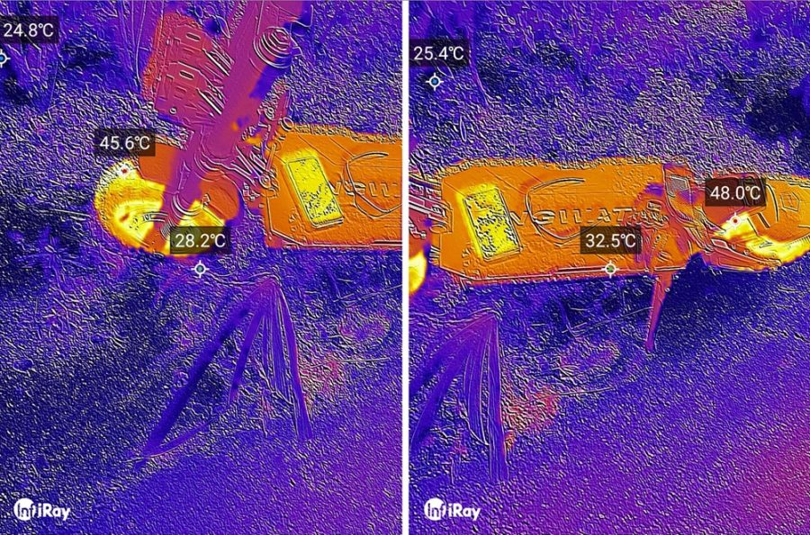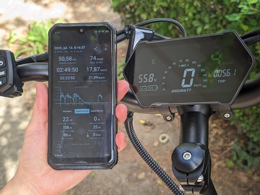 A tesztet július elején, ideális, 25°C-os hőmérsékleten, 100 kg-os pilótával végeztük. A rollert „Eco” módba, de 4-es sebességfokozatba állítottuk, így a haladási sebességünk 45−55 km/h között mozgott. A GPS adatok alapján a roller 50,58 km-t tett meg egyetlen töltéssel, ekkor a feszültség 55,8 V-ra, azaz 41%-ra esett, ami ebben a sebességtartományban, ekkora terheléssel kiemelkedően jó érték. Ez bizonyítja, hogy a minőségi akkucellákra való áttérés jó döntés volt: a hatékonyságuk kiváló. Melegedést sem tapasztaltunk a túra végén, a hőkamerás képeken ez látszik is.