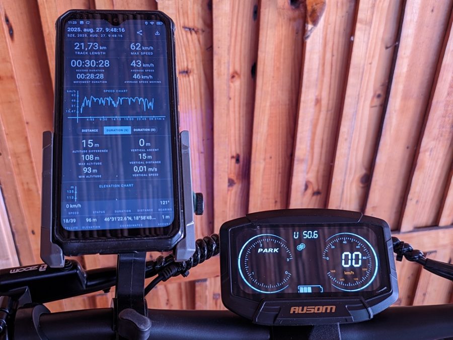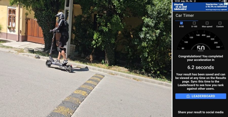 A végsebesség terén érdemes a GPS-re hagyatkozni. Míg a gyártó 68 km/h-t ad meg, a roller saját kijelzője terhelés nélkül 82 km/h-t mutat. A valóság 100 kg-os terheléssel GPS szerint mért 62 km/h, ami még mindig elképesztően gyors. Ebből látszik, hogy egy könnyebb, 65 kg-os pilótával a gyárilag megadott tempó is reális lehet.