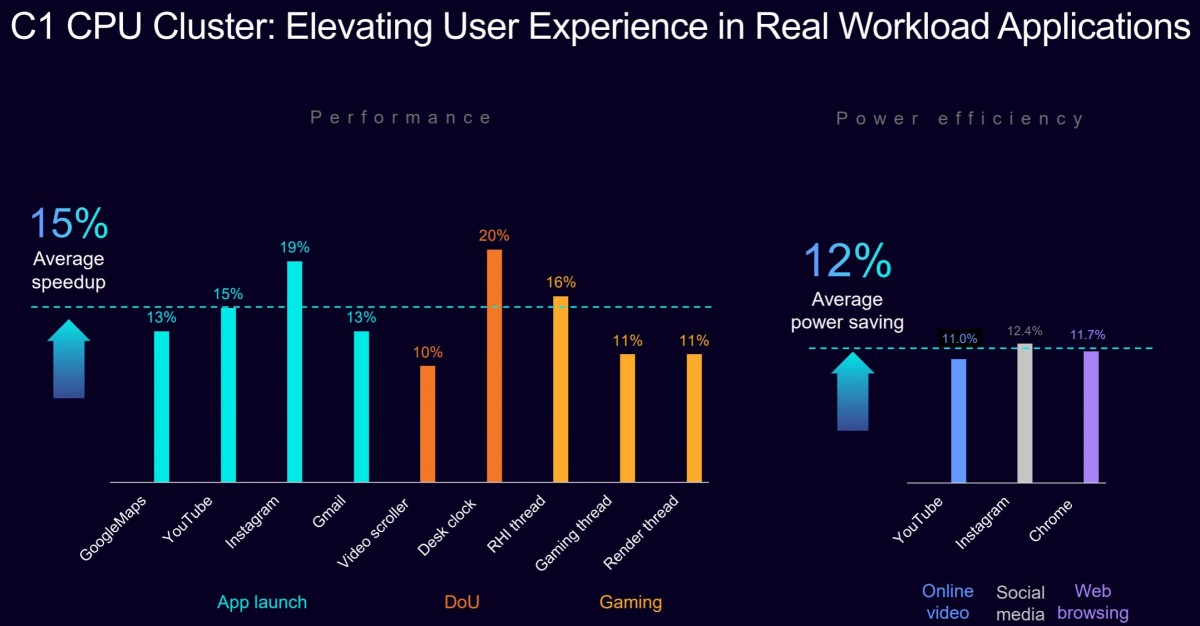 Összességében egy C1 klaszter átlagosan 30%-kal magasabb teljesítményt nyújt a benchmark teszteken, és 15%-os gyorsulást hoz a játékok és a videóstreaming közben, úgy, hogy átlagosan 12%-kal kevesebb energiát igényel. Az SME2-nek köszönhetően a mesterséges intelligencia teljesítmény a céget idézve drámaian megnőtt, bizonyos feladatoknál akár 4,7-szeres gyorsulás is tapasztalható.