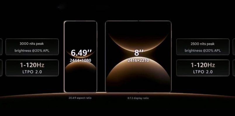 A Huawei Mate X7 megjelenítői némileg nőttek: a külső képernyő ezúttal 6,49 hüvelykes, 20,4:9-es képarány mellett, míg a belső panel 8 hüvelykes, ennek aránya 8:7,3. Mindkét kijelző esetében LTPO OLED technológiát alkalmazott a kínai gyártó.