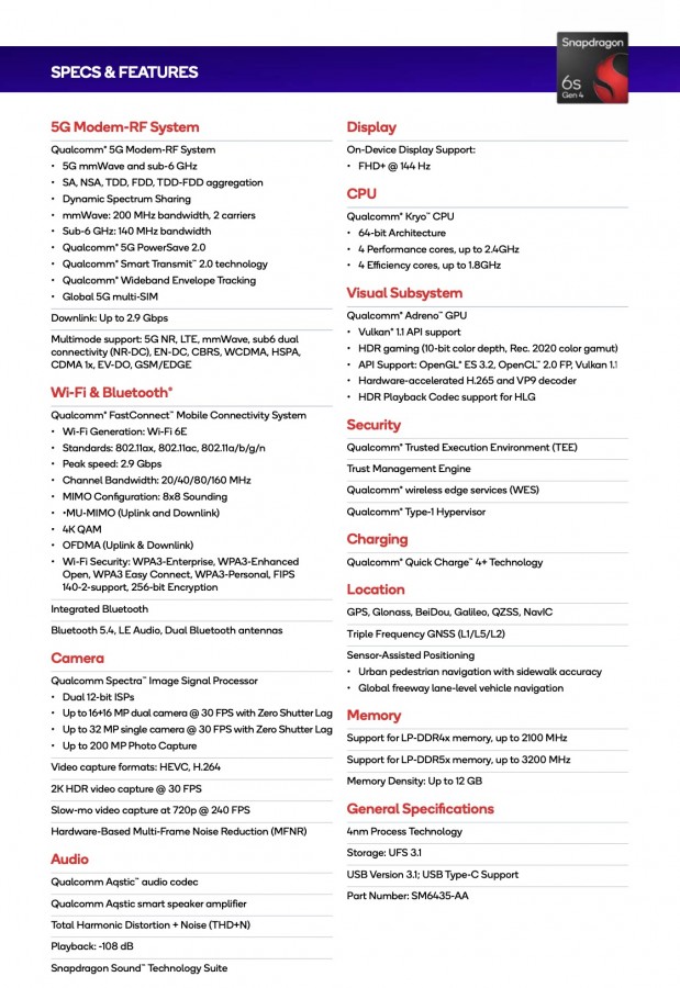 A Snapdragon 6s Gen 4 az SM6435-AA modellszámmal indul hódító útjára, és a Samsung 4 nanométeres gyártási eljárásával készül. A gyártó szerint a CPU teljesítménye 36, a grafikus vezérlőé pedig 59 százalékkal javult az előző generációhoz képest. A Kryo számítóegységeket magában foglaló CPU nyolc magot fog dologra: a négy teljesítménymag legfeljebb 2,4, a négy energiahatékony mag pedig 1,8 GHz-en pörög.