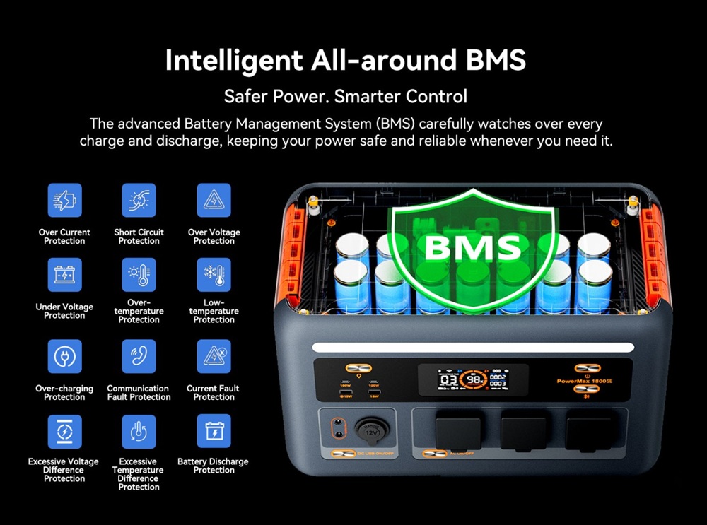 A rendszer működését egy BMS akkumulátor-kezelő rendszer felügyeli, amely védi az eszközt a túltöltéstől, túlmelegedéstől, túlterheléstől és rövidzárlattól.
