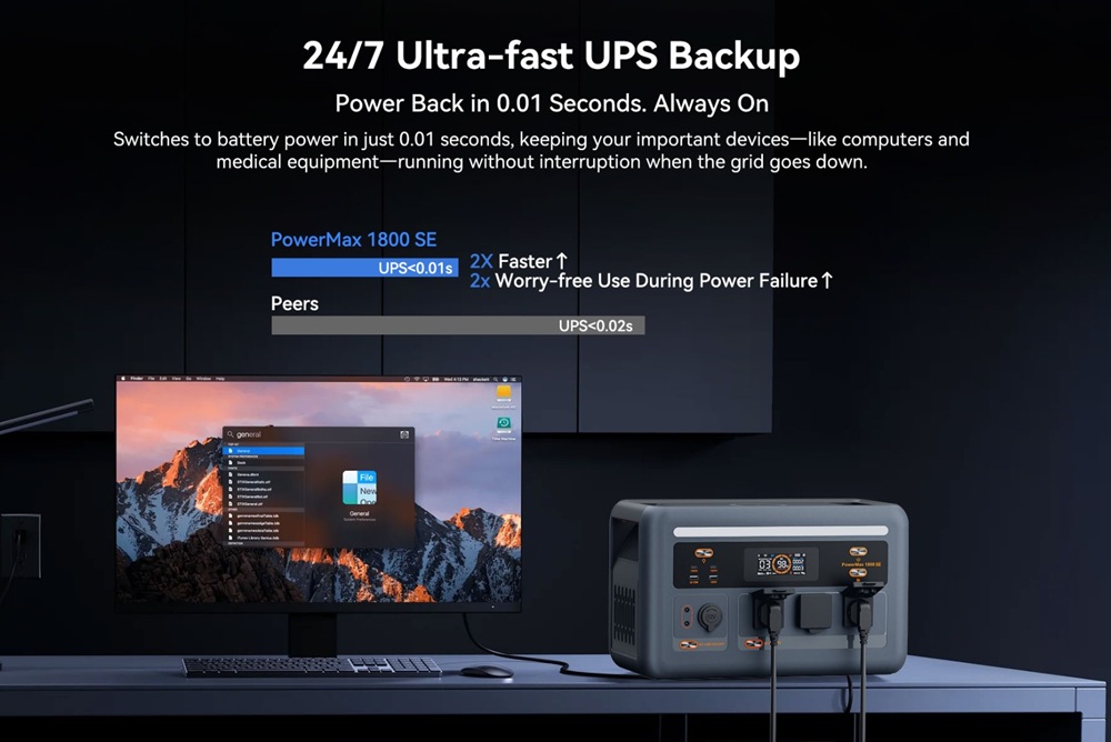 Fontos extra a szünetmentes tápegység (UPS) funkció: áramkimaradás esetén az eszköz kevesebb mint 20 ms alatt átkapcsol, így a rácsatlakoztatott számítógép vagy szerver nem indul újra, és az adatok sem vesznek el.