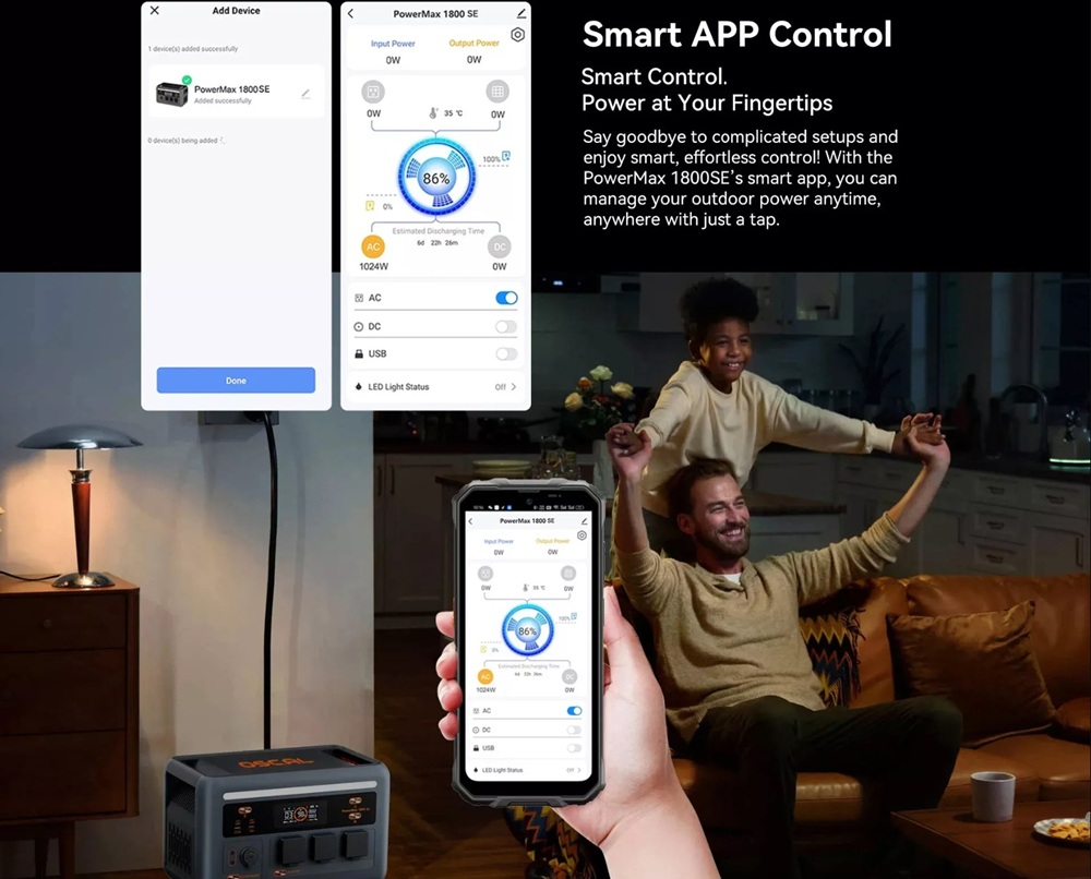 A modern igényeknek megfelelően a készülék okostelefonos alkalmazással is vezérelhető. Bluetooth vagy Wi-Fi kapcsolaton keresztül valós időben követheted a töltöttségi szintet, az aktuális kimeneti teljesítményt, valamint ki- és bekapcsolhatod az egyes portokat.