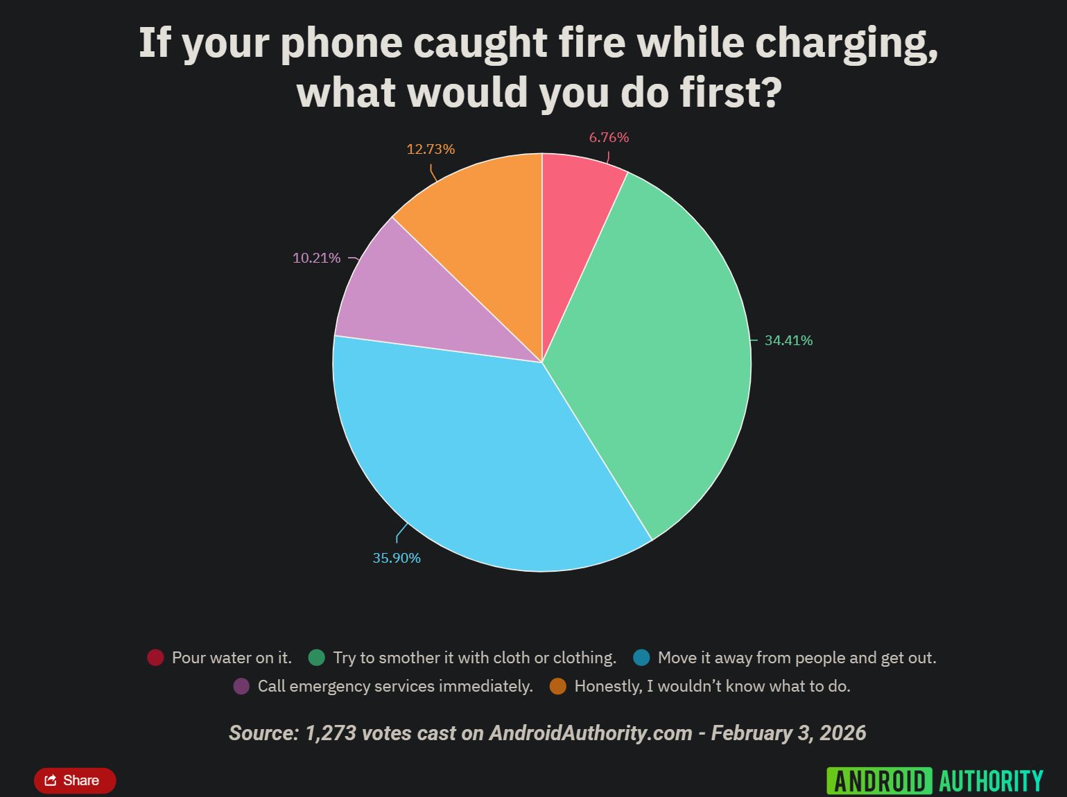 Emlékeztek, nemrég volt egy eset, kigyulladt egy Samsung Galaxy S25+, ennek kapcsán az Android Authority felmérést készített. Ennek keretében arról kérdezték olvasóikat, hogyan reagálnának, ha a telefonjuk töltés közben, vagy csak úgy általában hirtelen lángra kapna. Több mint 1200 válaszadó visszajelzései alapján a többség felkészültnek tűnik egy ilyen vészhelyzet kezelésére, és a legtöbben tisztában vannak a helyes eljárással.
