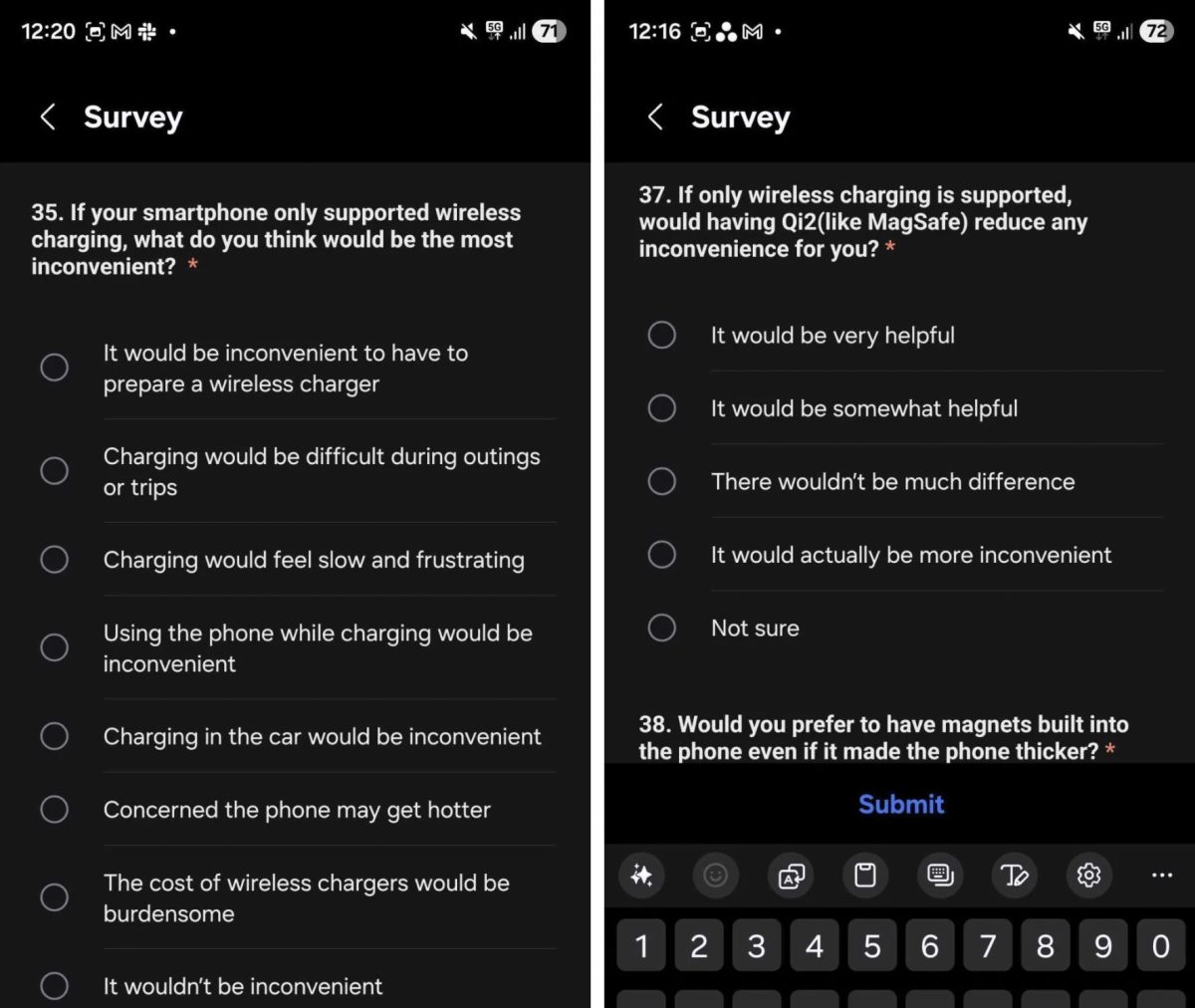 A gyártó közzétett egy kérdőívet a Samsung Members alkalmazáson belül, amelyben többek között arról faggatja a felhasználókat, hogy mennyire fontos nekik a mágneses (Qi2/Magsafe) töltés, illetve hogy mit szólnának, ha kizárólag ilyen módon lehetne táplálni egy készüléket, mennyire lenne zavaró a vezetékes töltési lehetőség hiánya.