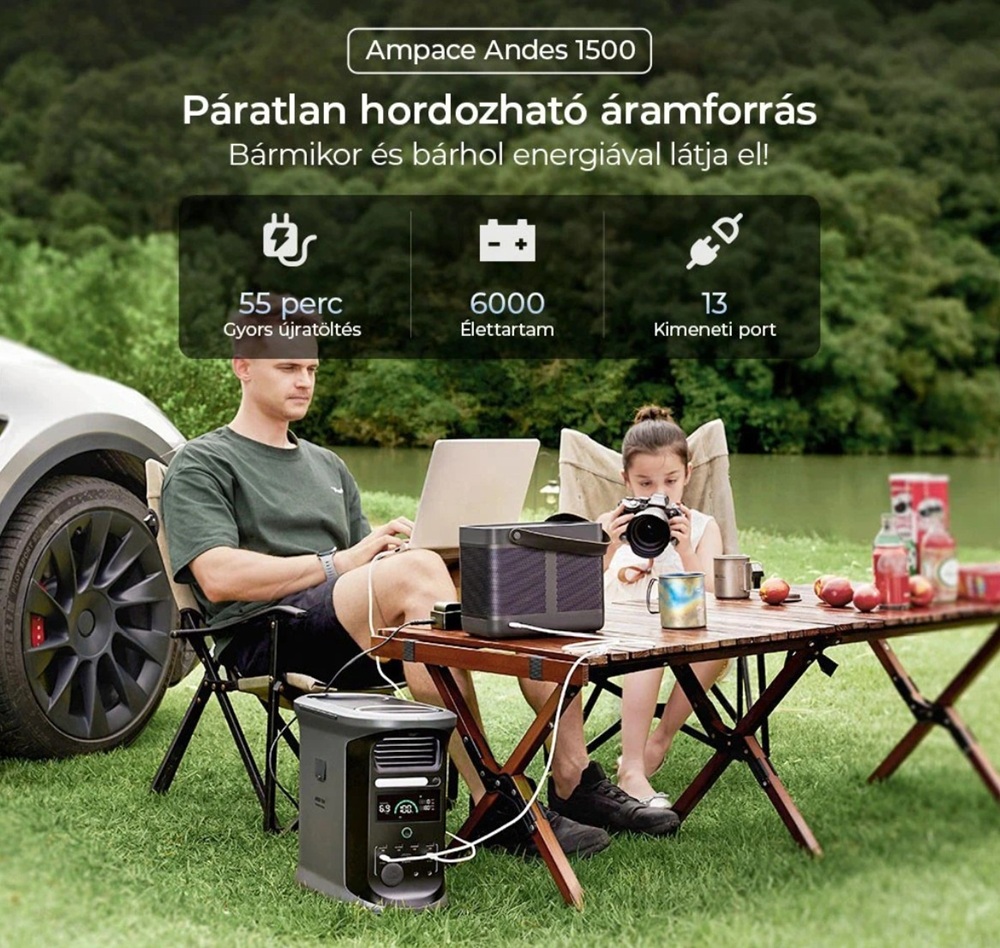 3. Ampace Andes 1500 hordozható erőmű: LiFePO4 technológiás akkumulátor 1462 Wh kapacitással és 2400W teljesítménnyel. Kempingezéshez vagy otthoni vészhelyzeti áramforrásnak is kiváló, 55 perc alatt feltölthető.