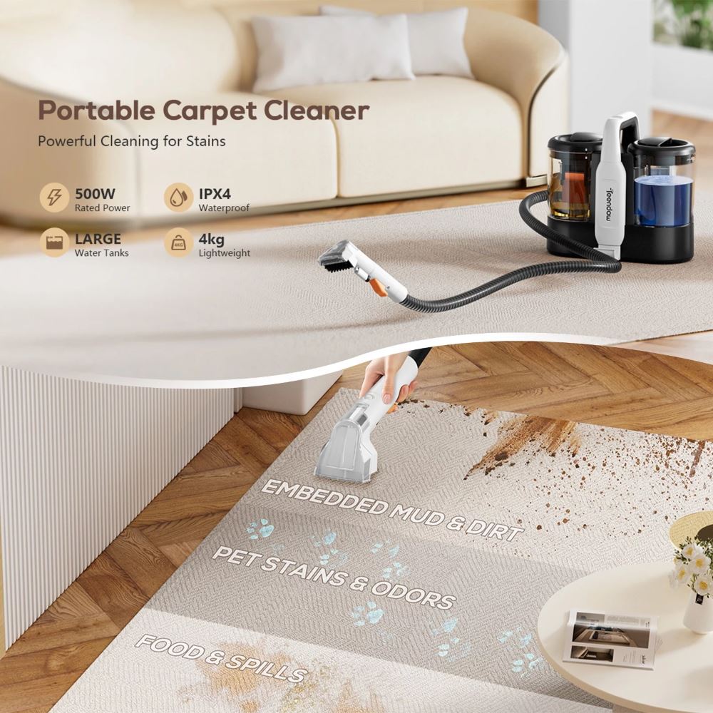 A Teendow C5 kárpittisztító 500 wattos motorral van felszerelve, amely 11 000 Pa maximális szívóerőt garantál a szőnyegek és a kárpitok mélyreható, alapos tisztításához. A készülékhez egy nagyméretű és egy kisebb kefe is tartozik, ezek lehetővé teszik a különböző típusú szőnyegekhez és a foltok méretéhez való alkalmazkodást, így sokoldalú tisztítást biztosítanak. A masinában egy 1500 ml-es frissvíz- és egy 800 ml-es szennyvíztartály is található, amelyekkel komolyabb tisztítási feladatokat is elvégezhetünk anélkül, hogy sűrűn meg kellene állni.