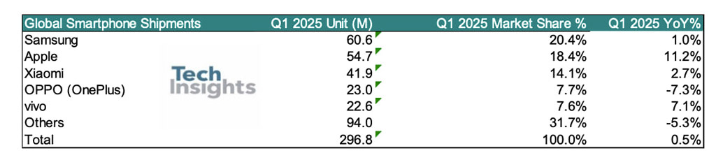 A kanadai TechInsights 2025 első negyedévére vonatkozó jelentése szerint a nemzetközi okostelefon-piac 0,5%-kal nőtt éves szinten, a gyártók pedig 296,8 millió készüléket szállítottak le. A vizsgált időszak alatt a Huawei globálisan a nyolcadik helyet szerezhette meg, ugyanakkor figyelemre méltó, 28%-os növekedést produkált a kiszállítások terén.