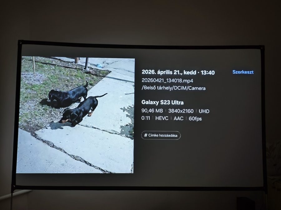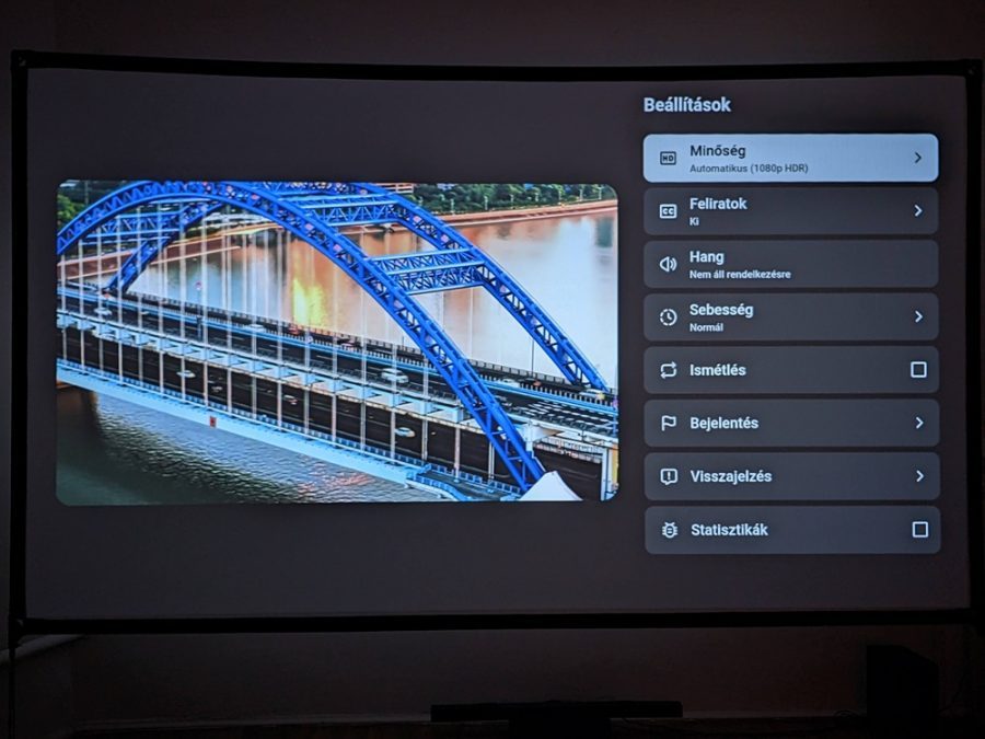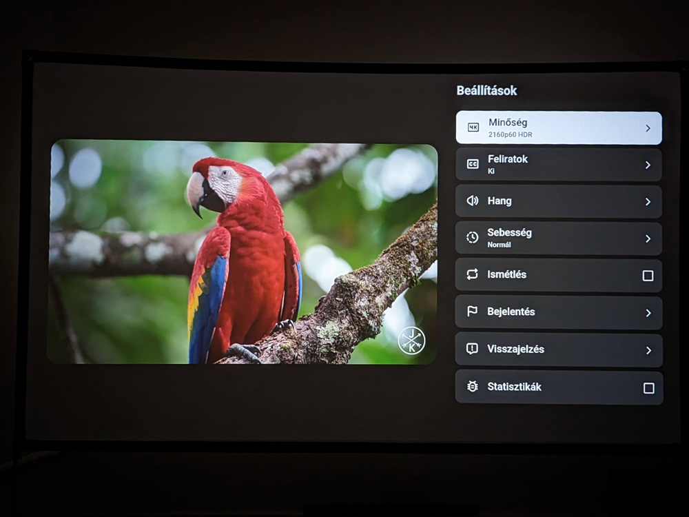 Érdekes módon a vezeték nélküli képernyőtükrözés (Chromecast) során a rendszer sokkal engedékenyebb. Egy Samsung Galaxy S23 Ultra telefonról tükrözve a projektor zökkenőmentesen és kiváló minőségben játszotta le a telefonnal készített natív 4K (3840×2160) videókat.