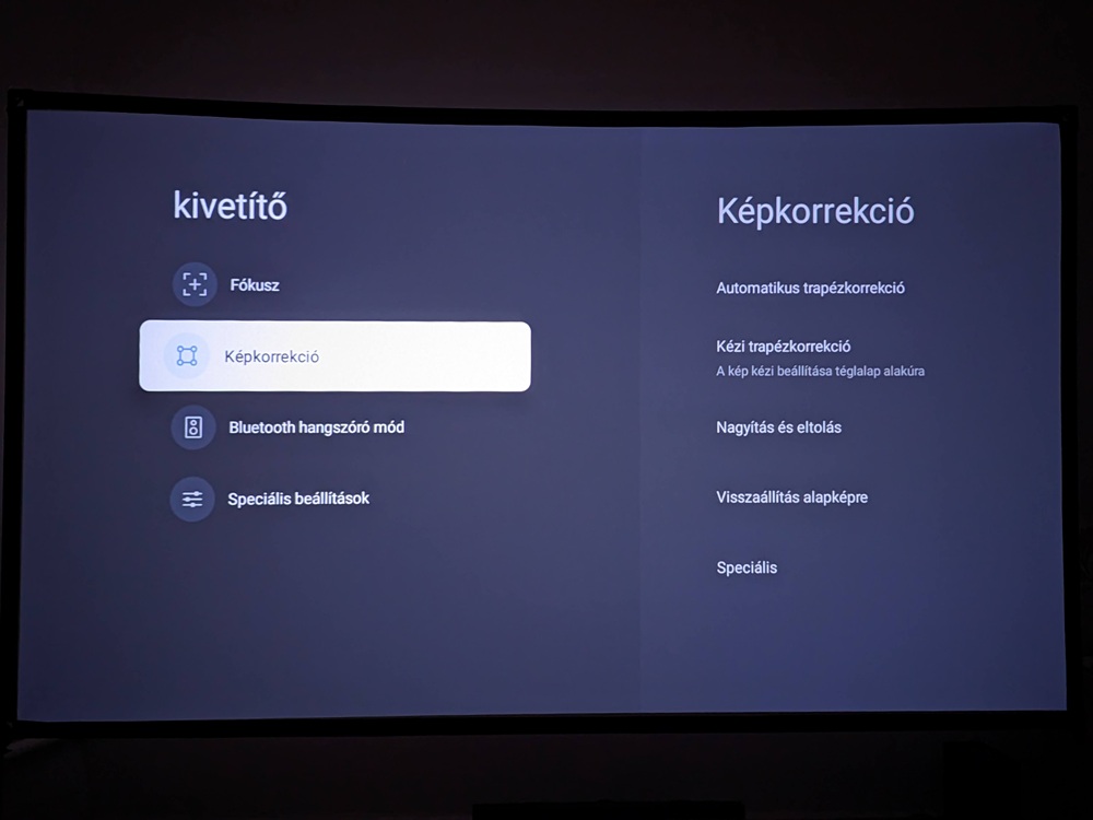 Ugyanakkor nagyon fontos a megfelelő vetítési távolság és pozicionálás: 120 hüvelykes képátló esetében a projektort ideális esetben 3,24 méterre kell elhelyezni a vászontól. Bár a készülék támogatja a ±30°-os automatikus trapézkorrekciót, ilyen helyzetekben a képélesség már nem marad tökéletes, különösen a sarkokban tapasztalható némi lágyulás. Több beállítással is kísérleteztünk, és tapasztalataink szerint már 15°-os oldalszögnél sem tudja az automata rendszer tökéletesen keretbe illeszteni a képet. A legjobb eredményt akkor kaptuk, amikor a projektort pontosan középre helyeztük, a vászonnal szemben egy polcra vagy egy tripodra.