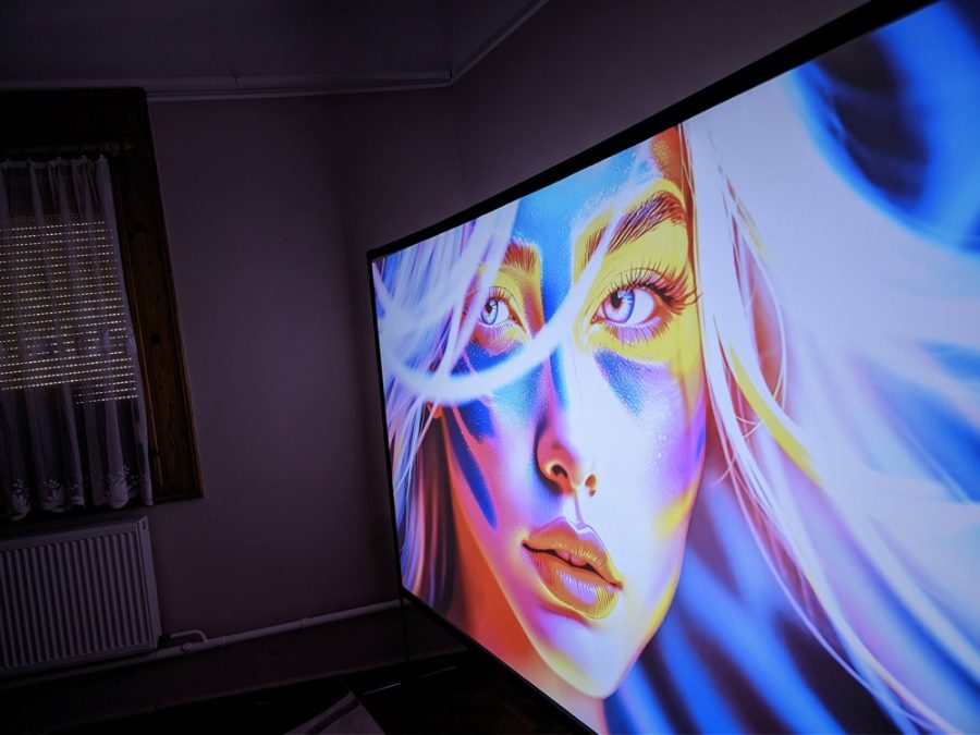 - Teljes sötétségben: Itt mutatkozik meg az igazi moziélmény. A 3000:1 kontrasztarány mély feketéket és vibráló színeket biztosít. A filmek sötétebb jeleneteinél is megmaradnak a részletek, a kép pedig éles marad a középpontban, minimális, a kategóriára jellemző lágyulással a szélek felé.
