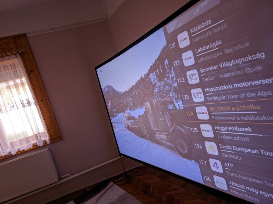 - Nappali fényben: A projektor még beszűrődő természetes fénynél is teljesen nézhető képet produkál. Ahogy a képeken látszik, a színek felismerhetőek maradnak, és bár a kontraszt érthető módon csökken, a NatGeo Wild dokumentumfilmjei vagy a Google TV menüje még ilyenkor is élvezhető. Ez nagy előrelépés az 1000 ANSI lumenes elődhöz képest, ahol ilyenkor már gyenge volt a képminőség.