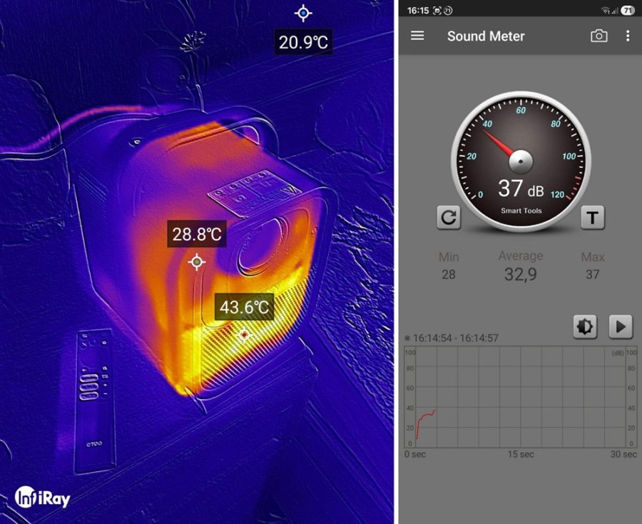A hűtési zajszint az egyik legkellemesebb meglepetés: Sound Meter alkalmazással mérve az átlagos zajszint mindössze 37 dB volt, ami érzékelhető javulás az előző generáció 42–44 dB-es értékéhez képest.