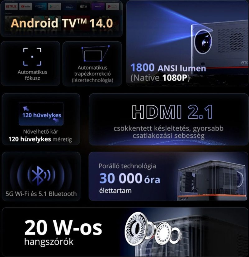 Az ETOE Whale Pro jelenleg a gyártó csúcsmodellje, amely már a frissített, Android TV 14 operációs rendszerrel érkezik – érdemes erre figyelni, mivel a piacon még megtalálható a korábbi, Android TV 11-es verzió is. A teljesen zárt optikai motorral szerelt projektor papíron 1800 ANSI lumenes fényerőt ígér, miközben hivatalos Google- és Netflix-támogatással szolgálja ki a streamingre építő felhasználókat, kompromisszumok nélkül. A hardveres alapokat egy Amlogic 905-ös processzor biztosítja 2 GB RAM és 16 GB tárhely társaságában, ami a gyártó ígérete szerint gördülékeny rendszerhasználatot garantál.