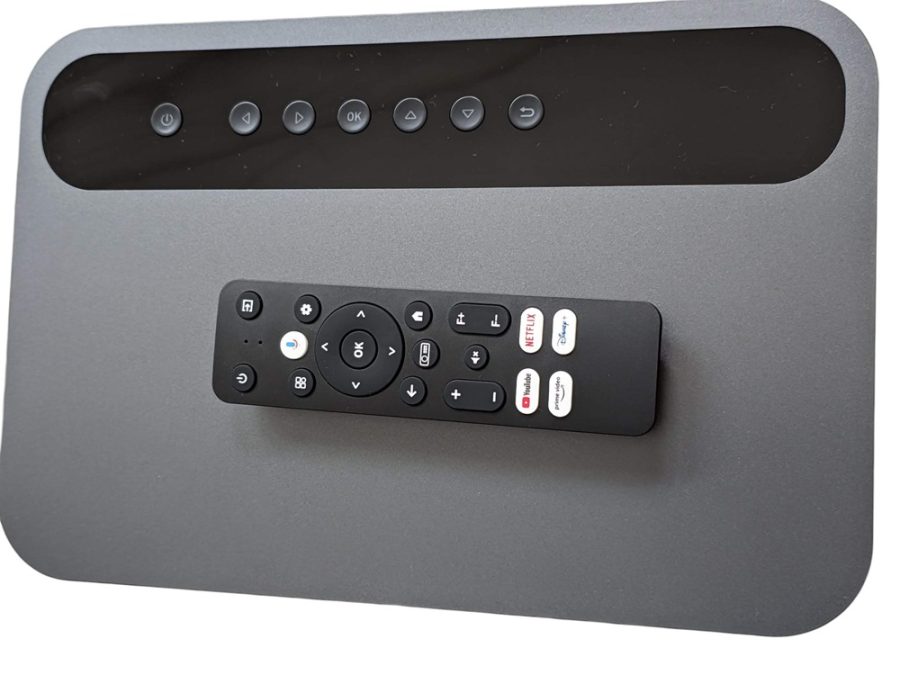 A projektor tetején egy fényes fekete sávban kaptak helyet a fizikai kezelőszervek. Itt navigációs nyilakat, egy OK gombot, visszalépés funkciót és a bekapcsológombot találunk. Fontos megjegyezni, hogy bár a navigáció megoldott, hangerőszabályzó gombot nem helyeztek el a gépházon, így ehhez mindenképpen a távirányítóra vagy a szoftveres menüre leszünk utalva. Az összeszerelés minősége példás, nincsenek recsegő-ropogó műanyagok, az alján található csúszásmentes gumilábak pedig stabilan tartják a gépet bármilyen felületen.