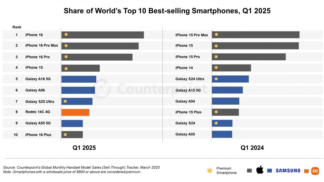 A második helyre az iPhone 16 Pro Max, a harmadikra pedig az iPhone 16 Pro került. A Pro szériás modellek adták ki az Apple összes iPhone eladásának közel felét 2025 első három hónapjában. A negyedik helyezett az iPhone 15, amelyet a Samsung legkelendőbb eszköze, az alsópolcos Galaxy A16 5G követ. Ez volt a legtöbbet eladott Android mobil 2025 elején.
