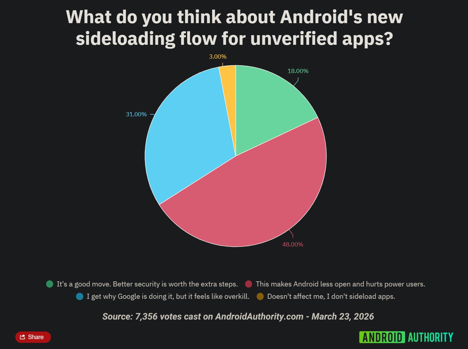 Mi is beszámoltunk arról, hogy a Google a múlt héten bejelentette: a jövőben a nem ellenőrzött fejlesztőktől származó alkalmazások letöltését extra lépésekhez és egy egyszeri, 24 órás várakozási időhöz köti. Az Android Authority több mint 7300 olvasóját vonta be egy felmérésbe, az eredményekből pedig kiderül, hogy a közösség erősen szkeptikus a lépést illetően. A válaszadók 48 százaléka szerint az újítás csorbítja a rendszer nyitottságát, és összességében véve hátrányosan érinti a haladó felhasználókat.