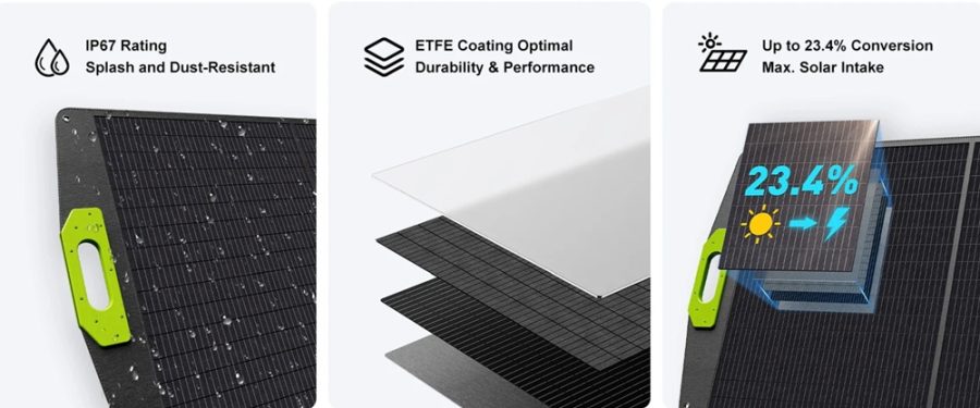 A panel az elődhöz hasonlóan négy szegmensből áll, amelyeket összecsukva egy táskaként hordozható egységet alkotnak. Az anyagminőség kiváló, a cellákat ETFE (etilén-tetrafluor-etilén) laminálás védi, amely rendkívül ellenálló az UV-sugárzással és a karcolásokkal szemben, emellett IP67 védettséget biztosít a cellák felületén a vízcseppek ellen, ami elengedhetetlen a kempingezéshez és kültéri használathoz.