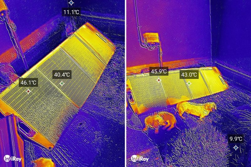 A mérések megerősítették, hogy a töltési teljesítmény és a hőkamerás vizsgálatok eredményei változatlanul kiválóak maradtak az előző SP200 modellhez képest. Fontos megjegyezni, hogy a tesztidőszak alatt a napsütés nem volt ideális, és a hőmérséklet is alacsony volt (mindössze 9,9°C), ami megnehezítette a csúcsteljesítmény elérését. Ennek tudható be, hogy a maximális mért termelés csupán 144 W volt. A hőkamerás vizsgálatok igazolták, hogy még tartós és magas teljesítményű töltés esetén sem merül fel túlmelegedési probléma, ami a cellák minőségét és az ETFE laminálás hatékony hőleadását mutatja.
