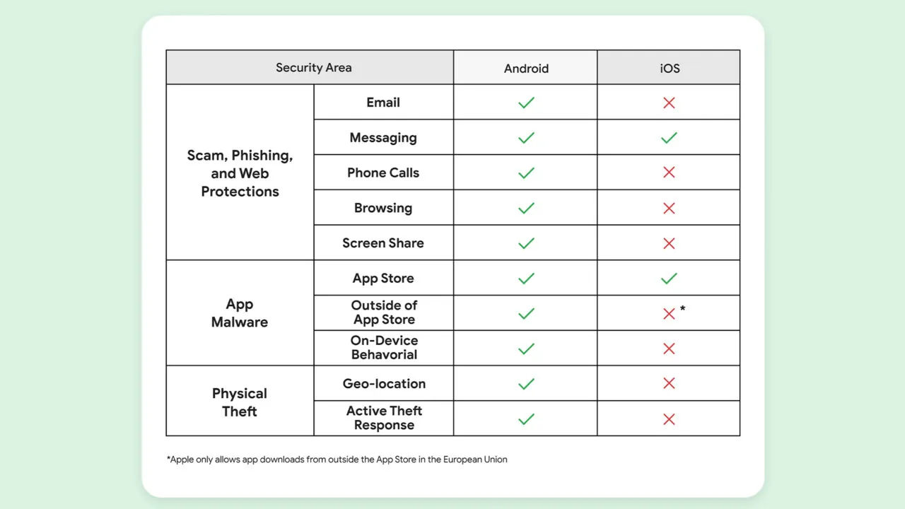 Az Android előnye a többrétegű védelemben rejlik, amely az Üzenetek, a Gmail és a Play Protect alkalmazásokban egyszerre működik. A Google Üzenetek mesterséges intelligencia segítségével már csevegés közben is megjelöli a gyanús üzeneteket. A Google Telefon applikációja képes automatikusan szűrni az ismeretlen hívókat, sőt akár hívás közben is figyelmeztet, ha a csaló érzékeny adatokat kér. Ráadásul ennek feldolgozása helyben, az eszközön történik.