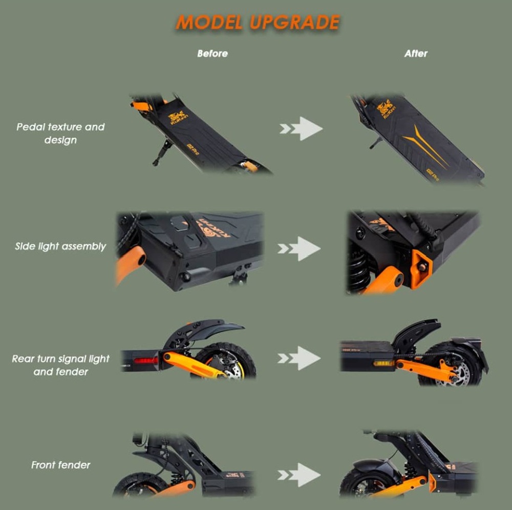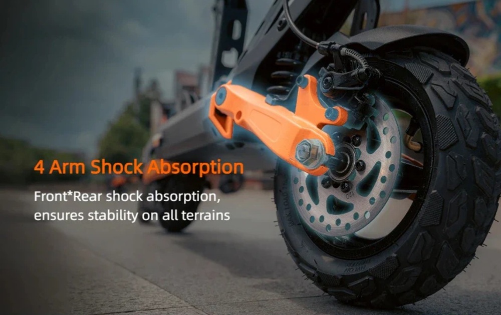 A KuKirin G2 Pro egyik legnagyobb erőssége a felfüggesztés: a négykaros lengéscsillapító rendszer hatékonyan szűri ki az úthibákat, legyen szó kátyús városi aszfaltról vagy kavicsos ösvényekről.