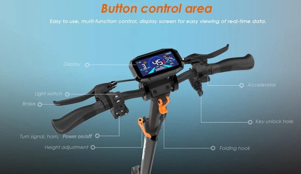 A kormányon található nagyméretű, nagy fényerejű kijelzőn pedig folyamatosan nyomon követhetjük a töltöttségi szintet, az aktuális sebességet és a megtett távolságot.