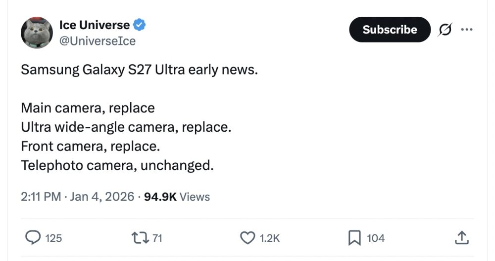 Az ismert szivárogtató, Ice Universe szerint a Samsung új főkamerával, új ultraszéles látószögű kamerával, illetve új előlapi kamerával készül a Galaxy S27 Ultra esetében. Konkrétabb részletek egyelőre nem derültek ki, de elég jelentős változásokra számítunk ezek alapján.