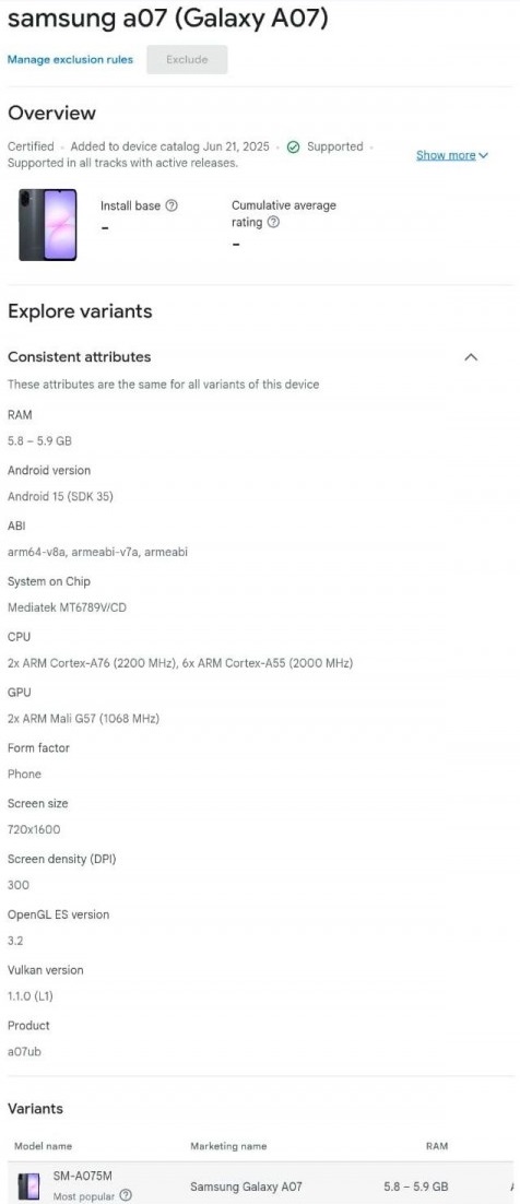 A Google Play Console egy másik érdekességet is elárul a telefonról. A Galaxy A07 modellszáma SM-A075, és a rendszerben feltűnt egy SM-M075 jelölésű készülék is. Ez arra utal, hogy a hamarosan érkező Galaxy M07 valószínűleg nem más, mint a Galaxy A07 egy átnevezett változata, a dél-koreai gyártó korábbi gyakorlatának megfelelően.