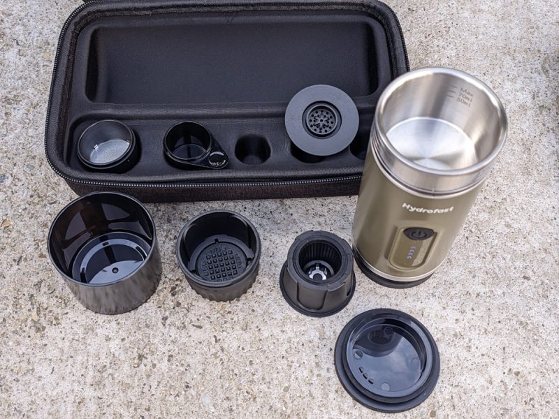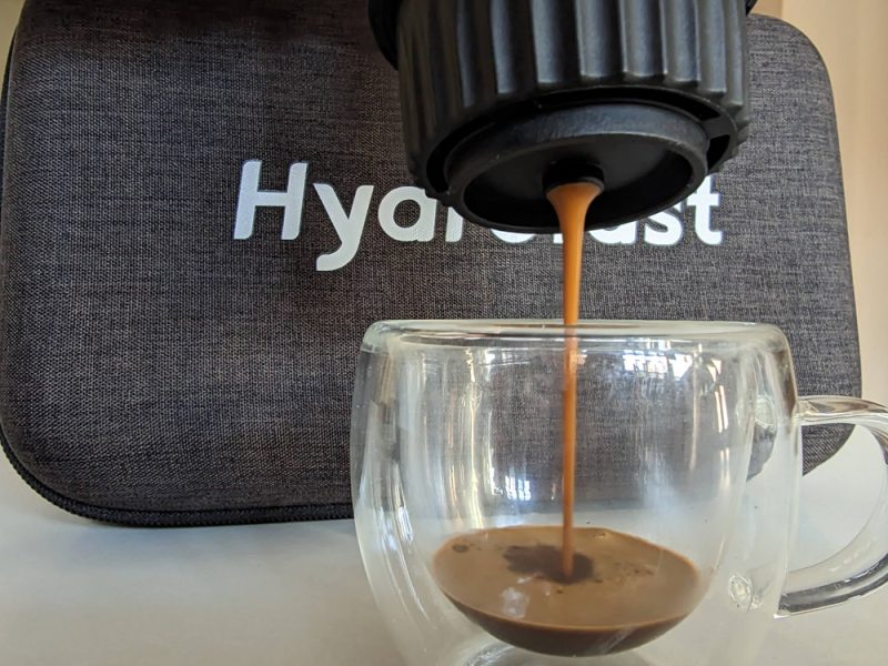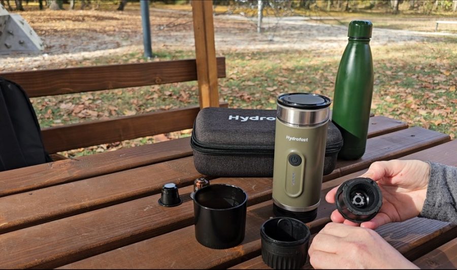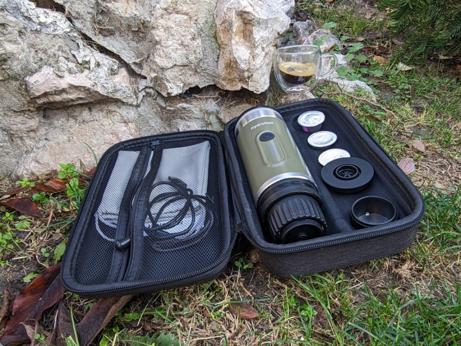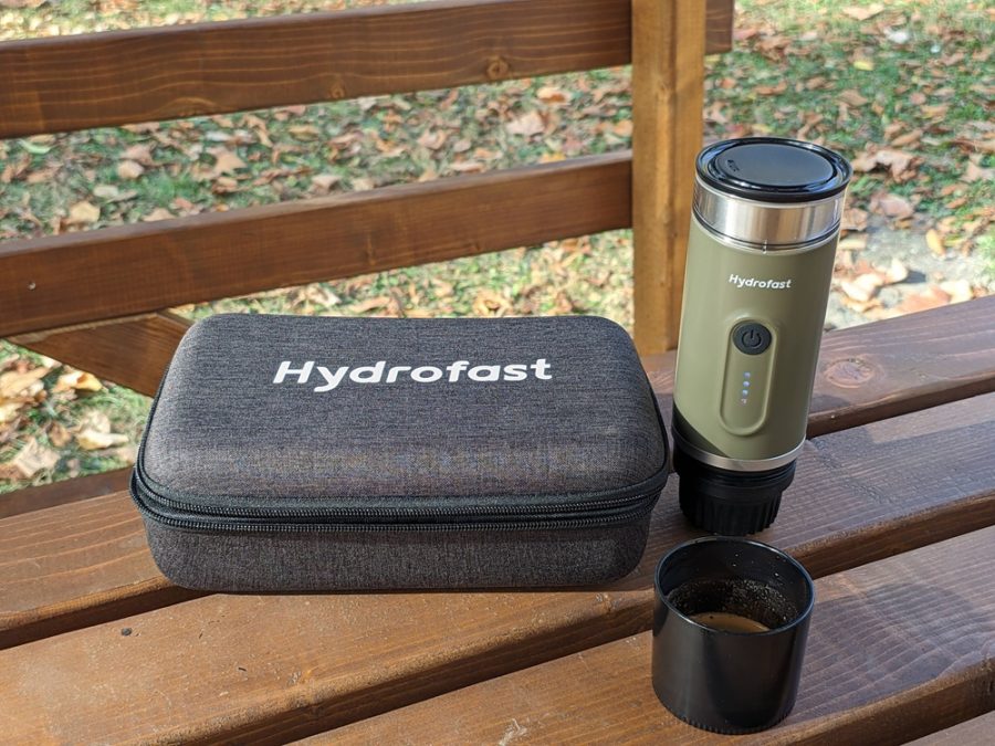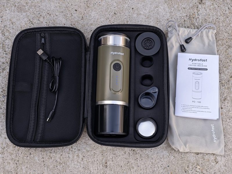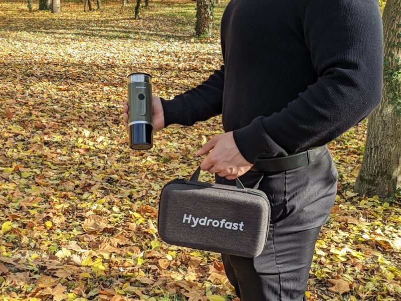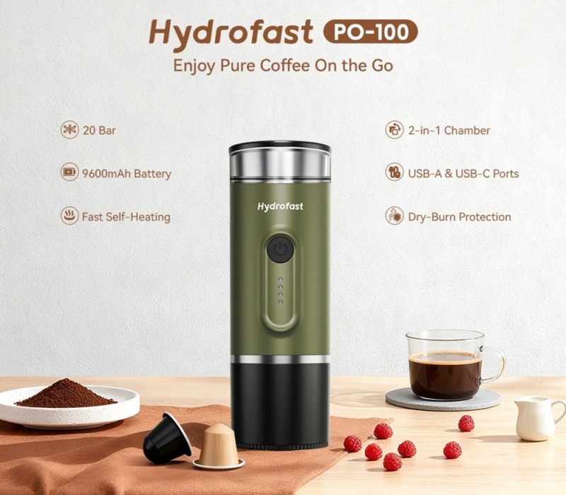 A Hydrofast PO-100 egy hordozható elektromos eszpresszókészítő, amelyet a szabadság jegyében terveztek. Főbb specifikációi közé tartozik a nagy, 9600 mAh-s akkumulátor, a 20 bar maximális nyomást biztosító szivattyú és a rugalmas, 2 az 1-ben kompatibilitás, amely lehetővé teszi az őrölt kávé vagy a Nespresso kapszulák használatát. Ezen tulajdonságok révén a készülék a komolyabb kategóriát képviseli a beépített fűtőelemmel rendelkező hordozható kávégépek között.