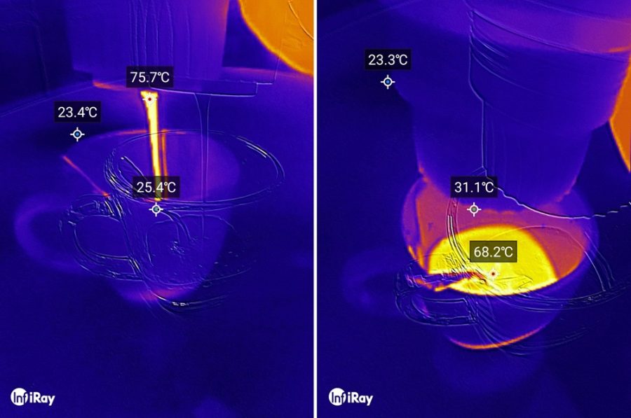 A hőkamerás kép (InfiRay) pedig azt mutatja, hogy a lefőtt kávé hőmérséklete a csészében 68.2°C, ami tökéletesen illeszkedik a 67°C ± 3°C-os olasz szabványhoz.