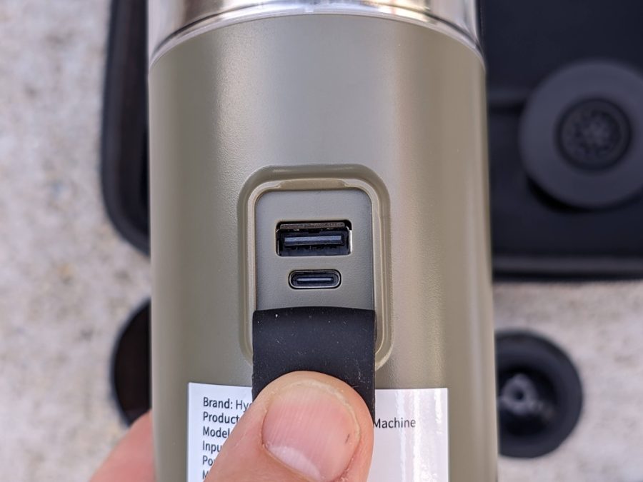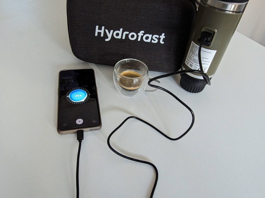 Hasznos extra funkció, hogy a Hydrofast PO-100 power bankként is használható, 10 W-os kimenő teljesítménnyel (USB-A port), így akár egy okostelefon is feltölthető róla útközben. Utazáskor a felhasználónak el kell döntenie, hogy a lemerült eszközét akarja energiával feltölteni, vagy a fáradt, álmos testét dobja fel egy jó kis eszpresszóval. Esetleg egy kis töltés utána egy kávé.