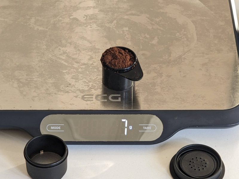 Az egyik korábbi képen látható, hogy a gép őrleményadapterébe grammra pontosan az ideális 7 gramm kávé fér.