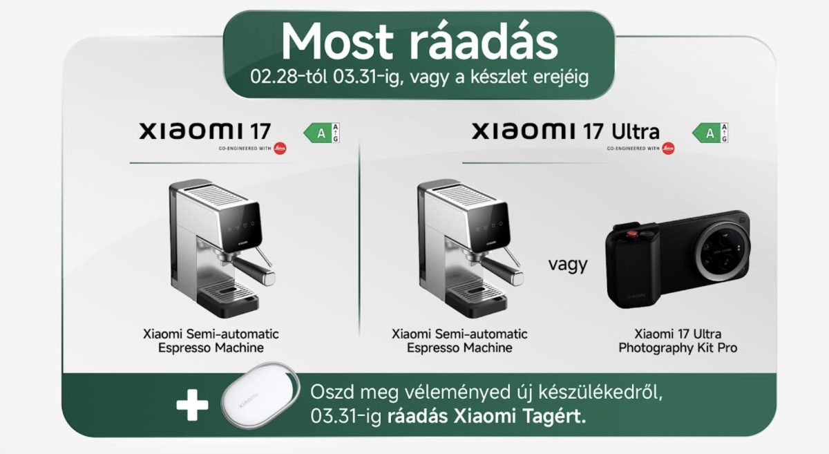 A Xiaomi 17 pedig a 12+256 GB-os alap változatban 359 990 Ft-ba kerül. Március 31-ig vannak bevezető akciók is, a telefonhoz Xiaomi kávéfőző jár, az Ultra modellhez pedig választhatunk a kávéfőző vagy a Xiaomi 17 Ultra Photography Kit nevű fotós kiegészítő között. Akik ráadásul a promóció alatt véleményt írnak a készülékről a partnerek valamelyikénél, egy Xiaomi Tag nyomkövetőt is bezsebelhetnek.