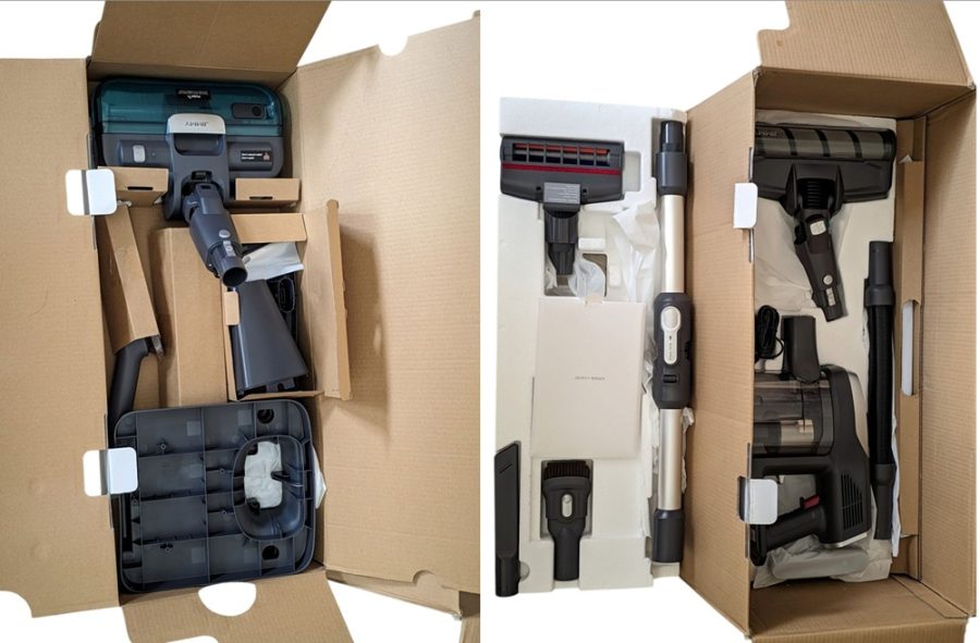 A JV9 Pro Aqua doboza a márkától megszokott módon tele van pakolva hasznos kiegészítőkkel. A kicsomagolás során egyértelművé válik, hogy a gyártó nem spórolt semmin, és egy teljes takarítási arzenált ad a pénzünkért.