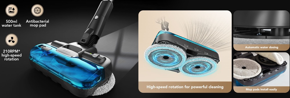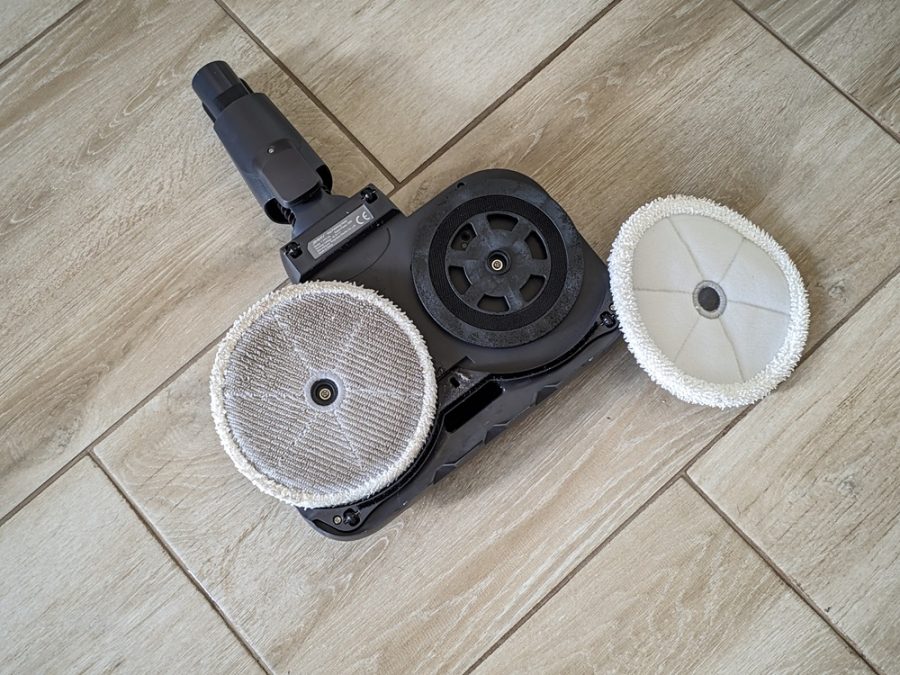 A felmosófejen található egy 500 ml-es tartály, amit tiszta vízzel (és padlótisztítószerrel) kell feltölteni. Ebből a folyadékot két, percenként 210-es fordulatszámmal pörgő mikroszálas korongra juttatja. Ez a forgó mozgás aktív súroló hatást fejt ki, amely hatékonyan távolítja el a padlóra száradt foltokat, például a kávé- vagy sárfoltokat.
