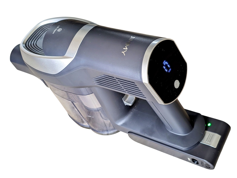 A markolat felett található egy intelligens LED kijelző, amely minden fontos információt megjelenít. Jól láthatóan mutatja a hátralévő akkumulátor-üzemidőt, a kiválasztott takarítási módot (Eco, Turbo, Max, Auto), valamint az esetleges hibaüzeneteket (F1-től F9-ig terjedő kódokkal). Itt érdemes megemlíteni egy apró, de furcsa tervezési sajátosságot: ha az akkumulátort a géptesten hagyva töltjük, a kijelzőn a töltöttségi szint fejjel lefelé jelenik meg, ami bár a funkcionalitást nem befolyásolja, mégis szokatlan.