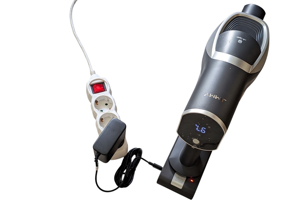 A Jimmy JV9 Pro Aqua egy 7 cellás, 2500 mAh (63 Wh) kapacitású akkumulátorral működik. Az akkumulátor kivehető, és külön is tölthető, ami rendkívül praktikus előny. Ez a funkció lehetővé teszi, hogy az akkumulátor töltése a porszívótól függetlenül történjen, és akár egy második akkumulátor beszerzésével (ha elérhető) a takarítás megszakítás nélkül folytatható legyen.