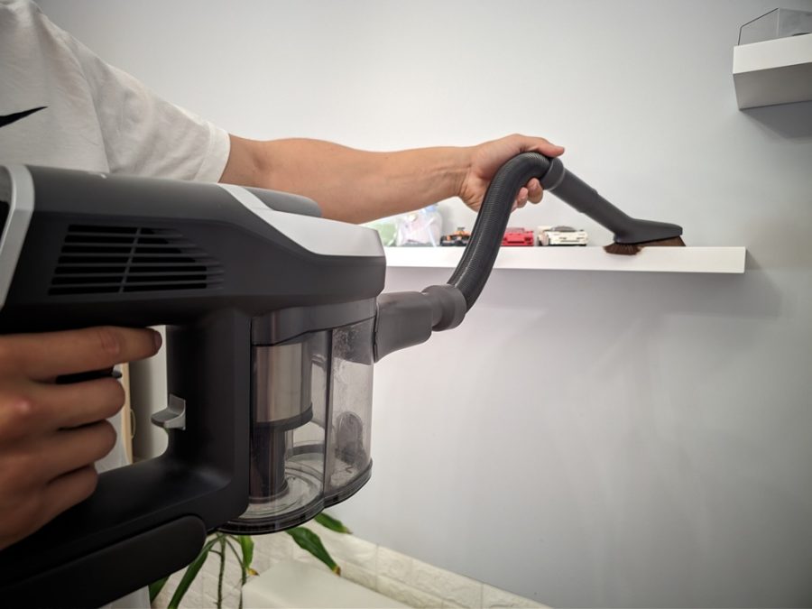 • Puha kefe flexibilis gégecsővel: Ez az egyik leghasznosabb tartozék. A nyújtható gégecső és a puha kefe kombinációja tökéletes kényes felületek, például billentyűzetek, lámpaernyők, műszerfalak vagy polcokon lévő dísztárgyak portalanítására.