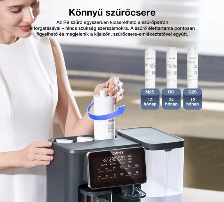 A Jimmy R9 háromféle szűrőbetétet használ: az M2S szűrőt (mikroszálas/aktív szén), az RO-2.0S szűrőt (fordított ozmózis membránszűrő) és a Q2S szűrőt (aktív szén ásványi szűrésű szűrő). Az RO szűrőbetétet (RO-2.0S) 3600 liter vagy 24 hónap, míg a Q2S és M2S szűrőket 1800 liter vagy 12 hónap után kell cserélni. Bár a készülék magasabb kezdeti beruházást igényel, a hosszú távú működési költségek könnyen átláthatóak és kalkulálhatók.