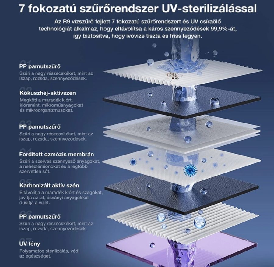 A fenti paraméterek azt jelentik, hogy a Jimmy R9 az egyik legsokoldalúbb, leggyorsabb asztali víztisztító a piacon – akár 3 másodperc alatt főzhetünk rajta forró teavizet vagy babavizet! A hétlépcsős szűrés — beleértve a 0,0001 mikronos RO-membránt és a remineralizáló szénszűrőt — klinikailag tiszta vizet biztosít miközben a fontosabb ásványi anyagokat visszajuttatja.