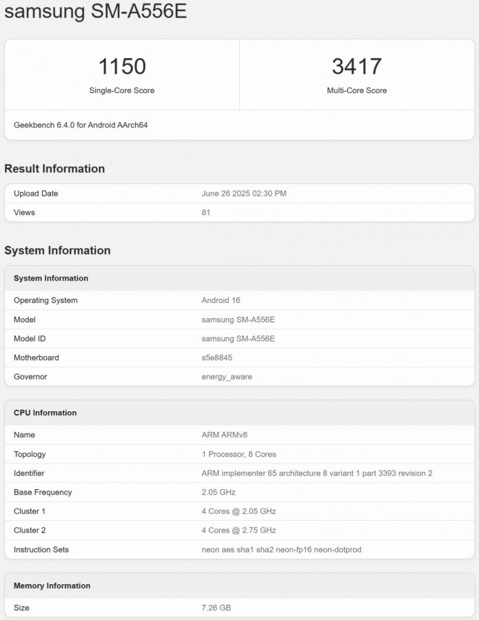 Erre utal az is, hogy a Galaxy A55 nemrég feltűnt a Geekbench nevű szintetikus tesztalkalmazás adatbázisában, mégpedig Android 16-tal. Nem akarjuk elkiabálni, de ez azt jelentheti, hogy a Galaxy A55 még 2025 vége előtt megkaphatja a stabil verziót, legalábbis a dél-koreai gyártónál nagyon ezen vannak. A feltételezések szerint a Samsung a következő néhány hónapban megnyitja a One UI 8 béta programot a Galaxy A55 tulajdonosok számára is, a stabil kiadás pedig 2026 előtt befuthat.